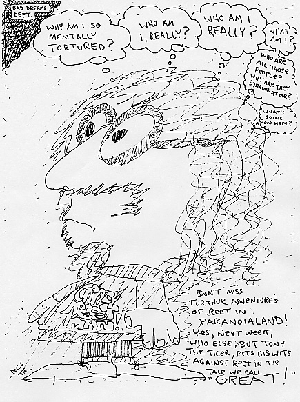 I first met The Reet in the Spring of 1973 in Boulder. This was just after his stint at the record store with you (Tony Reay) in Denver. We were crashing with Chip Stark, who remains a good friend today. We took turns sharing the couch and floor in an apt. at 1717 Spruce Street. We hit it off immediately and he turned me on to his collection of music which was definitely out of the mainstream for the early 70's. Besies his extensive collection of Dead bootleg tapes, artists such as The Bonzo Dog Band, Jake Holmes, Richard and Peter Sarstedt, Wildman Fisher, Capt. Beefhart, The Goon Shows, Spike Milligan, Roger Ruskin Spear, Lambert, Henricks, & Ross, and many others. Talk about eclectic! This was a strange mix for a kid from Philly who grew up with Doo Wop, the Delphonics, the O'Jays, and various soul, r &b, and Motown tastes. We also used to jam, with Reet on his guitar and me playing an African finger board (kalimba). We more than wore out our welcome at Spruce Street and sublet our own place during the summer of 1973 right across the street from the University of Colorado campus in the part of the student ghetto known as Buckley Land. Our third roommate was Willy Goodwin. We had a strange landlord named Dan who had a weird little senile, yippy dog named Shakey. I was driving a furniture delivery truck for American Furniture at the time. I was able to furnish our place with old furniture that was given to me by customers who wanted to get rid of it when they had new stuff delivered. Willy got a puppy that summer and named him Ralph. Ralph was a husky-mix and was our "family" pet. Ralph was unfortunately hit by a car just outside our apt early that summer. Ralph was a basket case. We had to work around the clock putting drops in her eyes. We also had to do tube feedings approximately every 2-3 hours from a bag directly into Ralph's stomach. Because I was working, Reet took up most of my share of helping out Willy in the doggie ICU which was usually our kitchen table. Another lighter memory of that apartment occurred around the 4th of July. I had a type of firecracker that you could set off by pulling strings attached at either end. By taping them to hinged-objects,these worked well as mini-booby traps. I went around the house rigging cabinet doors, refrigerator, shower curtain, and anything else that needed to be opened. This drove Reet crazy! He became really gun-shy about opening things because of his being easily startled. He would flinch, grimace, and slowly open things, expecting a bang. I'm sure I found this much funnier than he did. We had to move out of Buckley Land at the end of the summer, as the girls who had the lease returned to college. I moved into the mountains with Chip Stark to a place we rented in Nederland (the town suspected as a hideout of Patty "Tanya" Hearst during her SLA days). Reet and Willy got a place about a block away from Buckley Land, which became the hub of our Boulder friends and activities. - Wayne Binns